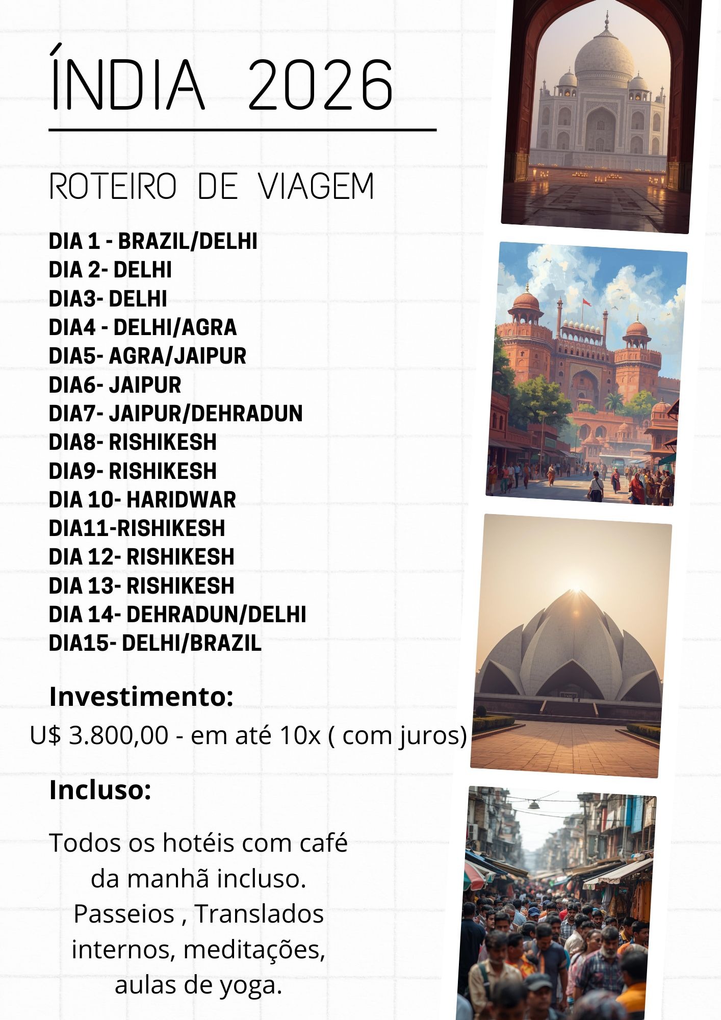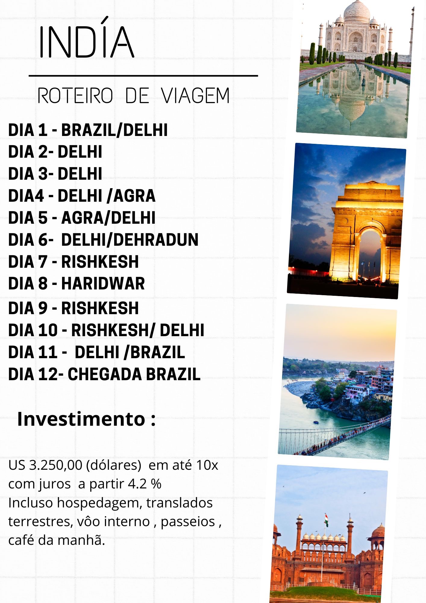 Nosso intinerário inclui as cidades de : Delhi , Agra , Jaipur , Dehradun , Rishikesh , Haridwar.
