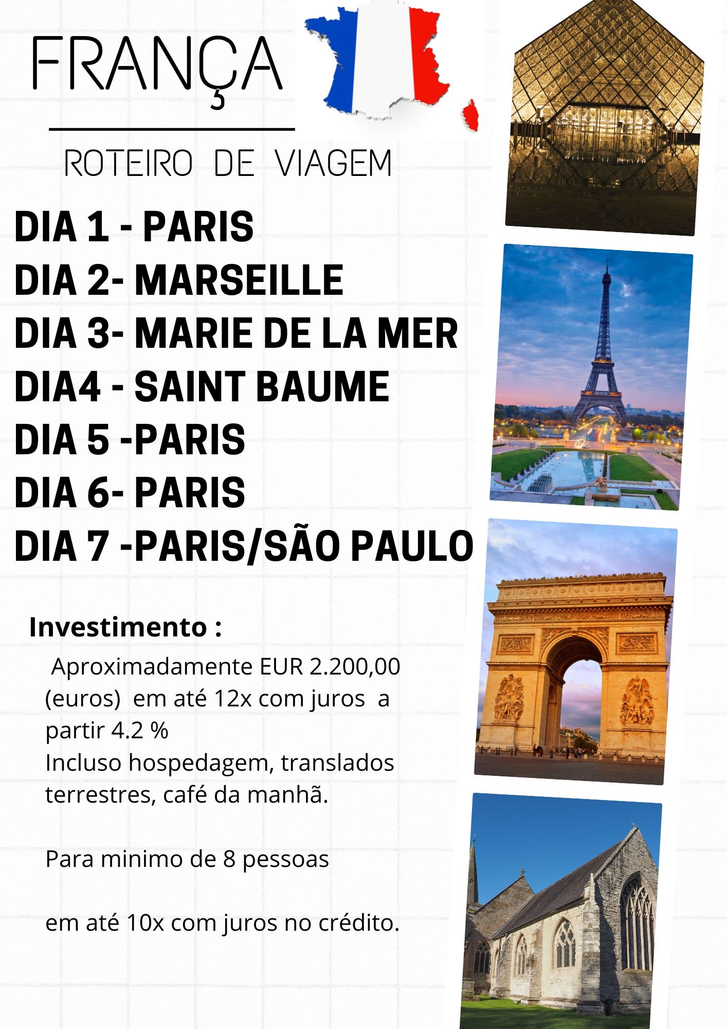 Chegamos por Paris e dali vamos em direção a Marseille ,, após seguiremos para Marie de la mér para registrar os passos de Maria Madalena, e depois em direção a Saint Baume conhecendo sua capela, a gruta e após, encerraremos nossa jornada com alguns dias livres em Paris.